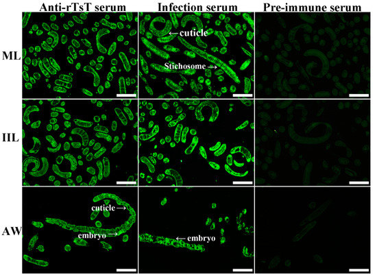 Tissue localization of TsT in worm cross-sections of T. spiralis ML, IIL and AW stages by IIFT. Fluorescence was observed at the whole worm section of ML and IIL, and intrauterine embryos of female adult. No immunostaining in worm cross-sections was found using pre-immune serum. Bar, 100 μm.