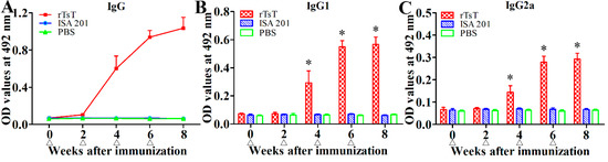 To determine anti-TsT antibody response, rTsT-specific IgG and IgG1/IgG2a in sera of all vaccinated mice were measured by rTsT-ELISA. Anti-rTsT IgG level was notably increased following the second immunization, anti-rTsT IgG titers reached 1: 105 two weeks after last immunization, suggesting that the rTsT is strong immunogenic. Furthermore, no mice injected with adjuvant ISA 201 or PBS alone showed any anti-rTsT IgG response (Figure 9A). The IgG1 level on weeks 4, 6 and 8 after immunization was obviously higher than IgG2a (t4w = 7.327, t6w = 5.916, t8w = 20.751, p < 0.0001) (Figure 9B,C), indicating that immunization with rTsT elicited the Th2-predominant concomitant Th1/Th2 response.