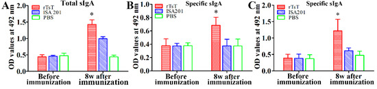 To evaluate enteral mucosal sIgA response to rTsT immunization, total sIgA and TsT-specific sIgA were assayed by ELISA. The results showed that the levels of total sIgA and TsT-specific sIgA of three groups had no significant difference before immunization (p > 0.05). Total sIgA level in mice immunized with rTsT at 8 weeks following immunization was clearly higher than those of ISA 201-injected mice and PBS group (F = 137.180, p < 0.0001) (Figure 10A). When The ELISA with ML crude antigens and rTsT were used, the anti-TsT sIgA levels in immunized mice were significantly higher than the mice injected with only ISA 201 or PBS (FML = 13.567, FrTsT = 16.042; p < 0.01) (Figure 10B,C). Enteral specific sIgA was not detected in mice injected with only adjuvant or PBS. The results suggested that subcutaneous vaccination with rTsT produced not only systemic antibody response but also significant intestinal local mucosal sIgA response.