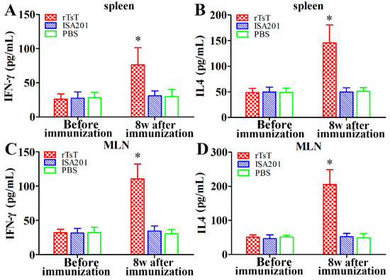 To assess the TsT-specific cellular immune responses, five mice of each group were killed before immunization and 8 weeks after immunization. Mouse spleens and mesenteric lymph nodes (MLN) were obtained and ground through a sterile steel mesh into complete RPMI-1640 medium (Gibco, Auckland, New Zealand). After being centrifuged at 1500× g for 10 min, the pellets were obtained, and the spleen and MLN cells were isolated as previously described [32,61], 2 × 106 cells/mL were cultured in RPMI-1640 medium containing 3% fetal bovine serum (FBS), penicillin (100 U/mL) and streptomycin (100 μg/mL). After stimulation with 4 μg/mL rTsT for 72 h at 37 °C, the supernatant was collected and concentration cytokines (IFN-γ and IL-4) were determined using a sandwich ELISA [62,63].