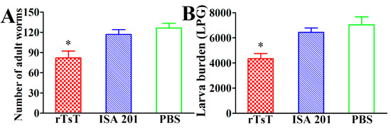 To assess the protection efficacy produced by immunization with rTsT, the remaining 20 mice of each group was each challenged orally with 300 infectious T. spiralis ML at 2 weeks after the last boost. At 5 dpi, 10 mice of each group were euthanized to collect the adult worms in intestines. The muscle larvae were recovered through artificial digestion of muscle tissues of additional ten mice of each group at 30 dpi [68]. The immune protective effect induced by rTsT immunization was assessed as the worm reduction of enteral adult worms and larvae per gram (LPG) of skeletal muscle tissues of immunized mice compared with the worms recovered from the PBS group [69,70].