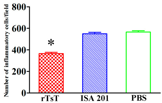 Histopathological changes of the intestines and masseter muscles of different groups of mice was examined at days 5 and 30 following challenge. The results showed that the number of inflammatory cells of intestinal mucosa in rTsT-immunized mice was obviously higher than the adjuvant and PBS control group (F = 258.842, p < 0.001) (Figure 14), whereas the number of inflammatory cells around encapsulated larvae in skeletal muscles in rTsT-immunized mice was obviously reduced compared to the adjuvant and PBS group (F = 199.256, p < 0.001) (Figure 15). The results suggesting that rTsT immunization appeared to enhance intestinal inflammatory infiltration in immunized mice which may accelerate the expulsion of adult worms from the gut. Furthermore, rTsT immunization alleviate the inflammation infiltration and relieve the Trichinella infection in skeletal muscle tissues of immunized mice.