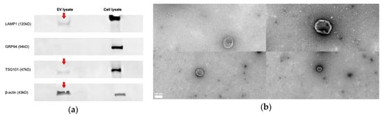 The average protein concentration across all EV samples was 506 μg/mL. Based on the International Society for Extracellular Vesicles (ISEV)’ recommendation, our results highlighted the presence of “EV-enriched” markers and the absence of non-exosomal markers in EV samples by Western Blot analysis [63]. Our results confirmed the presence of lysosomal LAMP1, a type I transmembrane protein, in both EV and cell lysate samples (Figure 1a). The LAMP1 protein bands identified in both samples were of slightly different sizes. This was expected, as the antibody detects a band of approximately 90–130 kDa. The variability in molecular weight is observed as a result of different levels of glycosylation of the target in different cell and tissue types [64]. In addition, endosomal TSG101, a cytosolic protein, and cytoskeletal β-actin proteins were detected in EV samples (Figure 1a). Moreover, as expected, the EV samples lacked endoplasmic reticulum protein, GRP94 (Figure 1a) [63]. Finally, EVs were examined for morphological characteristics by transmission electron microscopy (TEM), which revealed vesicles of 50–150 nm in diameter with morphological characteristics of EVs (Figure 1b).