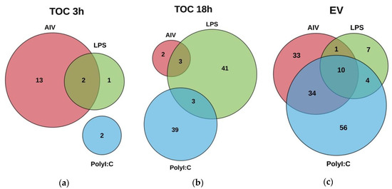 Venn diagram showing DE miRNAs in (a) TOC 3 h groups treated with AIV, LPS and polyI:C, (b) TOC 18 h groups treated with AIV, LPS and polyI:C and (c) EV groups treated with AIV, LPS and polyI:C. Lists of DE miRNAs for TOC 3 h, TOC 18 h, and EV treatment groups are shown in Tables S3–S5, respectively.