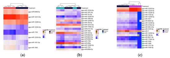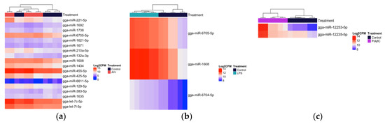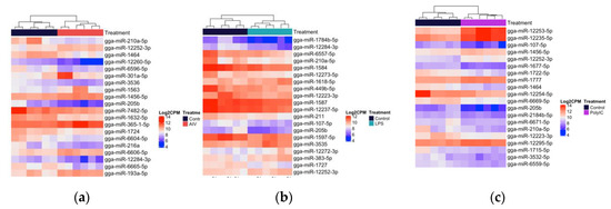 Heatmap with hierarchical clustering of miRNA distribution of the top cellular differentially expressed (DE) miRNAs (3 h) ranked by adjusted p-value (FDR). (a) The top 18 DE miRNAs (of 18 that pass the FDR threshold), AIV group. (b) The top three DE miRNAs (of three that pass the FDR threshold), LPS group. (c) The top two DE miRNAs (of two that pass the FDR threshold), polyI:C group. FDR < 0.05. The density of the colors represents the abundance of each miRNA in the scale of log2 counts per million (CPM).