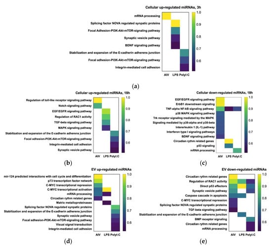 Pathway and gene ontology (GO) enrichment analysis on target genes of (a) up-regulated cellular (3 h), (b) up-regulated cellular (18 h), (c) down-regulated cellular (18 h), (d) up-regulated EV, and (e) down-regulated EV DE miRNA following treatment with AIV, LPS and PolyI:C. KnowEnG analytical platform (https://knoweng.org/analyze) was used to perform pathway and gene ontology (GO) enrichment analysis on these gene sets based on human database. The GO category analysis based on biological process for targets of DE miRNAs and the color intensities indicate the difference scores obtained from pathway analysis. Down-regulated (3 h) is not shown as there were no down-regulated DE miRNAs for both the TOC 3 h LPS and TOC 3 h polyI:C groups. The density of the colors represents the difference score. FDR < 0.05 and difference score >0.5.