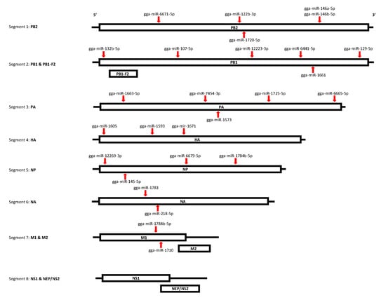 MiRNA target sites within AIV viral genome. The target sites for miRNAs within the AIV viral genome were predicted using the miRanda and RNAhybrid algorithms. All of the segments were found to be targeted by at least one miRNA, except segment 8 (NS1, NEP). One miRNA, gga-miR-1784b-5p, was found to target both segments 5 (NP protein) and 7 (M1 protein). Specific target positions for each miRNA can be found in Table 10.