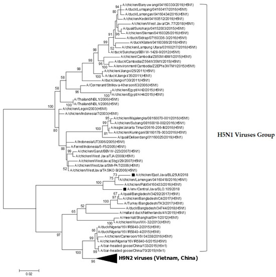 - Nishi, T.; Okamatsu, M.; Sakurai, K.; Chu, H.D.; Thanh, L.P.; van Nguyen, L.; van Hoang, N.; Thi, D.N.; Sakoda, Y.; Kida, H. Genetic Analysis of an H5N2 Highly Pathogenic Avian Influenza Virus Isolated from a Chicken in a Live Bird Market in Northern Vietnam in 2012. J. Vet. Med. Sci. 2014, 76, 85–87. [Google Scholar] [CrossRef] [PubMed]