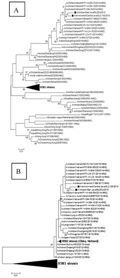 - Dharmayanti, N.L.P.I.; Hartawan, R.; Pudjiatmoko, H.W.; Hardiman, A.B.; Donis, R.; Davis, C.T.; Samaan, G. Genetic characterization of clade 2.3.2.1 avian influenza A(H5N1) viruses, Indonesia, 2012. Emerg. Infect. Dis. 2014, 20, 671–674. [Google Scholar] [CrossRef]