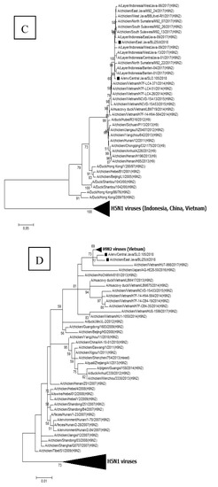 The results of the phylogenetic analysis showed that BLi25Ut/18 and SLO.105/18 isolates, which are the viruses, are suspected of having reassortment with the HPAI H5N1 virus in the PB2 gene (Figure 1) and one group with other Indonesian H5N1 viruses. The PB2 gene derived from the HPAI H5N1 virus will certainly cause changes in the biological character of the LPAI reassortant H9N2 virus. The other genes, i.e., PB1, PA, HA, NP, NA, M and NS, belong to the H9N2 viruses (Figure 2A–G). The viruses characterized in this study have close genetic relationships with the Vietnamese H9N2 viruses and most of the Indonesian H9N2 viruses.