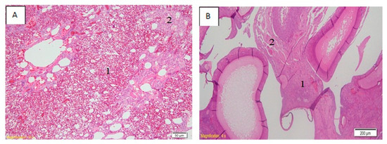 Histopathological lesions in lungs (A) and ovaries (B). Accumulation of fluid and hemorrhagic in lungs (A.1), as well as an infiltration of mononuclear cells (A.2). Mononuclear cell infiltration (B.1) and hemorrhagic (B.2) also occurred in ovaries.