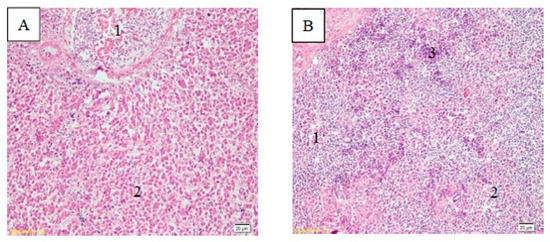 Histopathological changes in the liver (A) and spleen (B). The liver underwent hepatocyte necrosis and the infiltration of mononuclear cells (A.2); (A.1) is the portal tract; in the spleen, the white pulp area (B.1) shows necrosis and vacuolization (B.2), as well as lymphocyte cells accumulation (B.3).