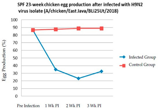 Initially before being infected with BLi25Ut/18 virus, egg production reached 86.33%; then, it decreased sharply to 35% at one week post-infection. At two weeks post-infection, egg production continued to decrease to 23.21%. At three weeks post-infection, egg production was slightly increased up to 32.63%. The total decrease of egg production for two weeks post-infection was 63.12%. At the end of study, the mortality reached 10% in chickens infected with BLi25Ut/18 virus.