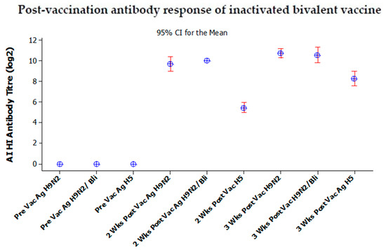 The antibody post-vaccination response in Group 1, using bivalent vaccine, is presented in Figure 8. The results showed that the average antibody titer against AI H9N2/2017, BLi25Ut/18 and H5N1/2013 antigens are 9.71 log2 (CI 9.01–10.41), 10 log2, and 5.42 log2 (CI 4.93–5.92), respectively after two weeks post-vaccination. Furthermore, in the three weeks after vaccination, the antibody titer increased sequentially, namely 10.71 log2 (CI 10.26–11.16), 10.5 log2 (CI 9.84–11.29), and 8.28 log2 (CI 7.58–8.98) against H9N2/2017, BLi25Ut/18, and H5N1/2013 antigens, respectively.