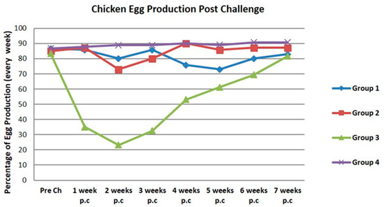 The group of vaccinated chickens using the bivalent vaccine (Group 1) showed a 6.67% reduction of egg production in two weeks post-challenge. Before being challenge with the BLi25Ut/18 virus, the egg production was 86.67%. Then, the egg production decreased to 80% after two weeks post-challenge. The eggs production started to increase to more than 80% after 6–7 weeks post-challenge (Figure 10). The results in the vaccinated chickens in Group 2, which received the monovalent H9N2 vaccine, showed 12.14% reduction of egg production after two weeks post-challenge. Initially egg production was 85% and decrease down to 72.86% in two weeks post-infection. The egg production started to increase in 4 weeks post-challenge. Group 3, without vaccination, showed 60.12% reduction of egg production (i.e., from 83.33% to 23.21%) in two weeks post-challenge. Group 4 as a control that was not challenge had stable egg production ranging from 86.67% to 90.71% during 7 weeks of observation. Statistical analysis showed that the decrease of egg production at 2 weeks post-challenge was significantly different between groups (p Value < 0.05). The results of the challenge test from the parameters of egg production showed that the vaccinated chicken groups gradually increased its egg production by ≥80% ranging from 4 to 7 weeks after challenge.