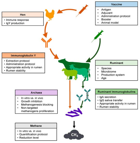 In summary, the possibility of applying vaccines to mitigate CH4 production from enteric fermentation in ruminants has been repeatedly suggested. Nevertheless, it is complicated to evaluate the real effectiveness of this strategy. Few studies have directly assessed the complete approach, i.e., from vaccination to enteric animal CH4 emission measurement. Furthermore, the great variety in methods is an obstacle in comparison of results from different studies in an appropriate and repeatable way. However, the strategy has been considered promising by many authors, and more research is needed to reach a rigorous conclusion on its feasibility, practical implementation, and sustainability. Various steps should be considered for future studies, such as antigenic capacity, Igs in saliva (IgG transfer and IgA production), action and stability of Igs in the rumen, and, finally, how to evaluate CH4 production.
