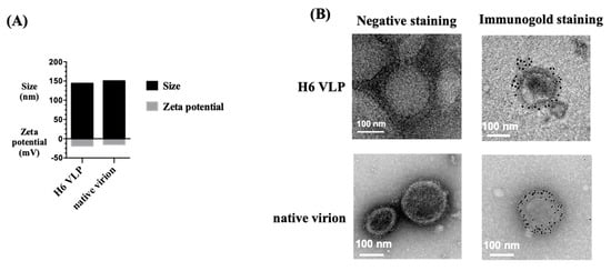 Characterization of H6 VLPs. (A) The size and surface zeta potential of H6 VLPs and native virions were measured using NanoSight. (B) The H6 VLPs and native virions were imaged using TEM under negative staining and immunogold staining using the H6/HA monoclonal antibody. Bar = 100 nm.