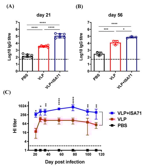 To examine the immune-potentiating effect of the H6 VLPs in chickens, 3-week-old SPF chickens were administered a primary and a booster vaccination of PBS or 432 HAU H6 VLPs with or without adjuvant ISA 71 VG on day 0 and day 21. The capacity of these groups to display a humoral immune response was evaluated by detecting the presence of H6N1 AIV-specific antibodies in the sera of the vaccinated chickens using ELISA or a HI test. We analyzed the time-course of HA-specific antibodies induced by the vaccine group for 112 days. As shown in Figure 3A, on day 21, a single-dose inoculation of VLPs in chickens with or without the adjuvant effectively elicited anti-H6N1 AIV antibodies, with a mean titer of 103.6 in the VLP alone group and 105.1 in the ISA 71 VG-adjuvanted group. The ISA 71 VG-adjuvanted VLPs induced a significantly higher antibody response than the VLPs alone (p < 0.0001).