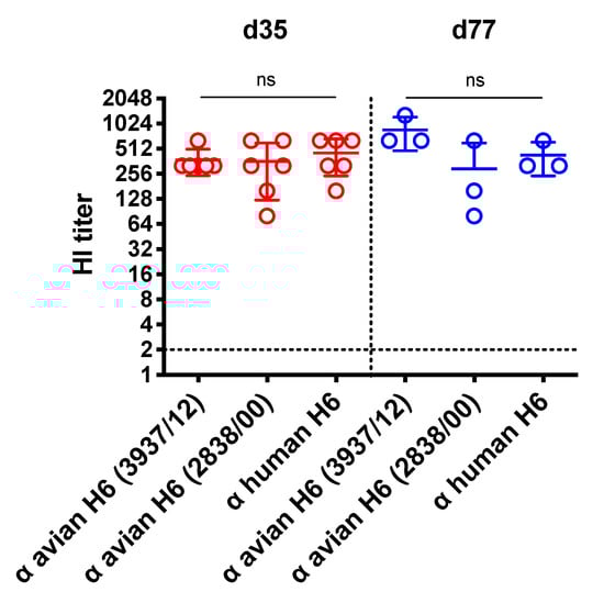 The cross-reactivity of the VLP plus ISA 71 VG-induced serum antibodies against other avian or human H6N1 isolates was examined by a HI test. As shown in Figure 4, the mean HI titers were 373, 360 and 453 at 35 dpi against chicken H6N1 3937/12, 2838/00 and human H6N1 (A/Taiwan/2/2013), respectively. At 77 dpi, while the VLP plus ISA 71 VG-induced serum consistently showed a high antibody level (mean titer: 853) against the 3937/12, the cross-reactive HI titers against the 2838/00 or the human H6N1 slightly decreased. The HI titer against the chicken H6N1 2838/00 was 293; toward the human H6N1, it was 426. There were no significant differences among these groups.