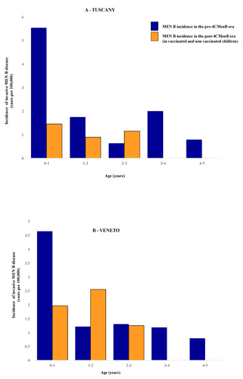 Since vaccination was introduced in Tuscany in 2014 and in Veneto in 2015, the post-vaccine era was defined as 2014–2018 in Tuscany and 2015–2018 in Veneto. Therefore, data referred to children 0–5 years of age in Tuscany and 0–4 years of age in Veneto.