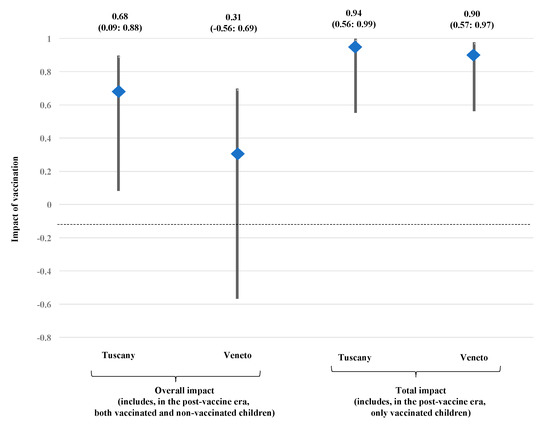 The incidence rate ratio (IRR) and the impact of vaccination in the two regions are shown in Table 3. The overall impact, evaluated including cases recorded in both vaccinated and non-vaccinated children, was 0.68 (95% CL 0.09; 0.88 in Tuscany and 0.31 (−0.56; 0.69) in Veneto. The total impact, including cases found in vaccinated children only was 0.94 (95% CL 0.56; 0.99) in Tuscany and 0.90 (95% CL 0.57; 0.97) in Veneto. The data are shown in Figure 2.