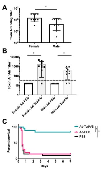 Groups of male and female outbred CD-1 mice were immunized via i.m. injection a single time with PBS, 1010 virus particles of SC-Ad6-TcdA/B, or a negative control vector SC-Ad6-PEB1 that expresses a mismatched protein from another bacterium, Campylobacter jejuni (n = 10 per group). Single immunization generated significant antibodies against TcdA in the majority of the SC-Ad6-TcdA/B vaccinated animals within 6 weeks (Figure 1A,B). Serum endpoint titers at week 6 were significantly higher in female mice immunized with SC-Ad-TcdA/B than in males (Figure 1A). Neutralizing titers aginst TcdA were significantly higher in the female (160-fold increase) and male (40-fold increase) groups compared to sex-matched controls. (Figure 1B). Both sexes of animals generated significant antibody responses. Female binding titers were significantly higher than male titers. A similar pattern was observed in the TcdA nAb titers from the two sexes, but these differences were not significant. When these were compared to animals immunized with SC-Ad6-PEB1, those receiving SC-Ad6-TcdA/B had nAb titers that were significantly higher than their sex-matched controls.