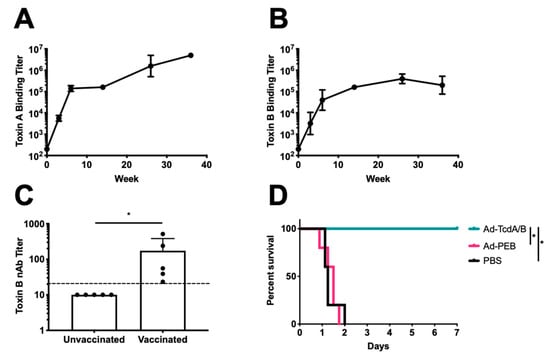A second set of female CD-1 mice were immunized i.m. a single time with 1010 virus particles of SC-Ad6-TcdA/B, SC-Ad6-PEB1, or PBS (n = 5 per group). This single vaccination of SC-Ad6-TcdA/B generated strong antibody responses with reciprocal endpoint binding titers for TcdA and TcdB over 26 weeks that climbed above 100,000 (Figure 2A,B). At week 26, we measured the TcdB neurtralizing titers and found that the vaccinated animals’ titers were 17-fold greater than controls (Figure 2C). At week 38, the mice were challenged with 300 ng (6 × LD50) of TcdA. All PBS and SC-Ad-PEB1 animals succumbed to the toxin within 48 h (Figure 2D). All animals in the SC-Ad-TcdA/B vaccine group survived.