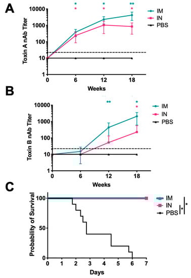 Serum collected at weeks 6, 12, and 18 showed increasing TcdA and TcdB nAbs as in the first vaccination study (Figure 4A,B). At week 18, TcdA nAbs were over 160-fold greater than the controls in the i.m. group and 20-fold greater in the i.n. group. TcdB titers at this time were 6-fold greater in the i.m group and about 2-fold greater in the i.n group. At week 24, half of the hamsters in each group were challenged using the low-dose challenge method. This surprisingly induced no symptoms or indications of C. difficile infection in any hamster. Serum antibodies collected at their termination revealed no increases in TcdA or TcdB antibodies due to the challenge compared to unchallenged animals in the cohort. The unchallenged animals were followed for an additional 20 weeks. In this period, one PBS and one i.m. immunized animal became moribund and had to be euthanized at weeks 42 and 44, respectively.
