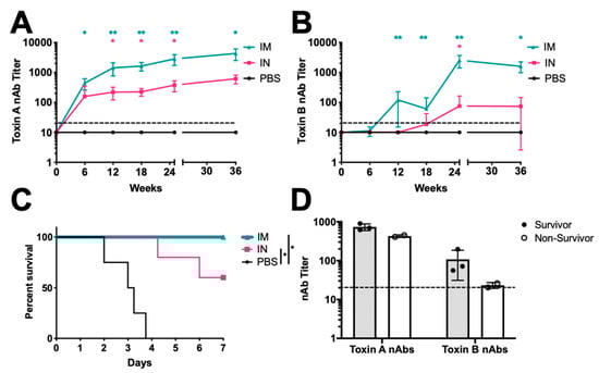 SC-Ad6-TcdA/B provides protection against lethal spore challenge 45 weeks after single immunization. Female Syrian hamsters (n = 10) were vaccinated i.n. or i.m. with 1 × 1011 virus particles of SC-Ad6-TcdA/B, or i.n. with PBS. Serum collected at weeks 6, 12, 18, 25, and 36 weeks after immunization were assayed to determine mean neutralizing titers for (A) toxin A and (B) toxin B. In both panels, points show the mean titer, bars show standard deviation, and the dotted line indicates the limit of detection (*Adjusted p < 0.05 compared to control, **Adjusted p < 0.05 compared to control and i.n. route). X-axis break represents the termination of the low-dose challenge study; serum collected at week 36 from remaining animals in each group (n = 5). (C) Survival curve for i.n. (n = 5) and i.m. (n = 4) SC-Ad-TcdA/B vaccinated animals challenged with UK1 spores 45 weeks after single immunization shows significant protection compared to PBS control animals (n = 4) (* p < 0.01). (D) Week 36 neutralizing toxin A and toxin B neutralizing titers of i.n. immunized animals that survived the challenge compared to non-survivors. Columns show the mean titer, bars show standard deviation, and the dotted line indicates the limit of detection.