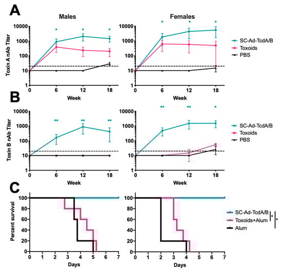 Groups of 5 male and 5 female Syrian hamsters were immunized once i.m. with 1011 virus particles of SC-Ad6-TcdA/B, 10 ug each toxoids A and B with alum, or alum alone. Serum collected at weeks 6, 12, and 18 showed increasing TcdA and TcdB nAbs in the SC-Ad6-TcdA/B (Figure 5A,B). In contrast, the toxoid immunization only generated TcdA antibodies. Twenty weeks after the single immunization, hamsters were challenged with the high dose of spores. In the males at week 18, TcdA nAbs were 140-fold greater than the controls in the SC-Ad6-TcdA/B immunized group and 20-fold greater in the toxoid immunized group, while the TcdB antibodies were 40-fold greater in the SC-Ad6-TcdA/B group and below the limit of detection in the toxoid group. In females, the TcdA nAb titers were over 350-fold and 30-fold greater than the controls in SC-Ad6-TcdA/B and toxoid groups, respectively. The TcdB nAb titers at the time were about 60-fold greater than the controls in the SC-Ad6-TcdA/B group and 2-fold greater in the toxoid group. All of the toxoid and alum immunized animals succumbed to spore challenge (Figure 5C). As in the pevious challenges, all of the SC-Ad6-TcdA/B vaccinated hamsters survived to the end of the study. Comparison of the survival curves demonstrated that toxoid immunized animals had no significant advantage compared to animals that only received alum. A single immunuzation with SC-Ad6-TcdA/B generated signifcant protection compared to both toxoid and alum immunized animals.