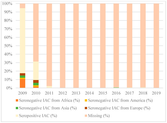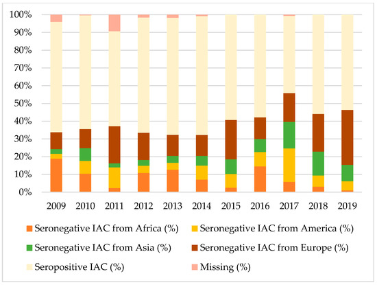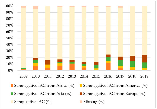 Figure 1, Figure 2 and Figure 3 show the percentages of seropositive and seronegative IAC by year of the first visit in Italy when serology was performed. Seronegative IAC were additionally divided by country of origin.