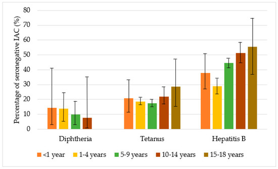 Figure 4 shows the percentages of seronegative children in the study for diphtheria, tetanus, and hepatitis B, by age group. Protection against diphtheria ranged from 85.7% to 100% and protection against tetanus from 71.4% to 82.5%, with no statistically significant differences in the different age groups (p > 0.05). Protection against hepatitis B was higher for children aged from one to four years (71.2%) than for children of the other age groups (p < 0.001), and in general, IAC up to nine years were more protected against hepatitis B than older children (p < 0.001) (Table A1 in the Appendix A).
