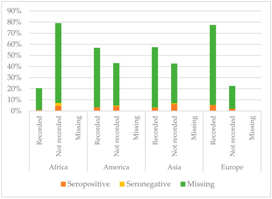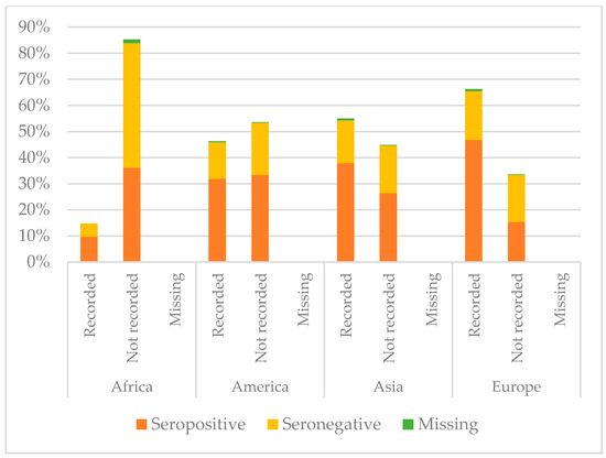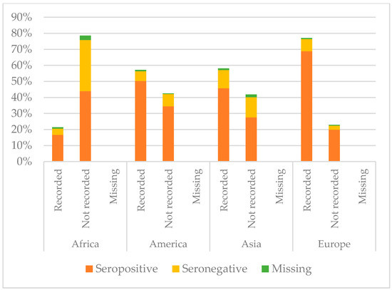 Figure 6. Comparison between immunisation status of IAC reported in the documentation and serology for tetanus, by continent of origin (Table A3 in the Appendix A).