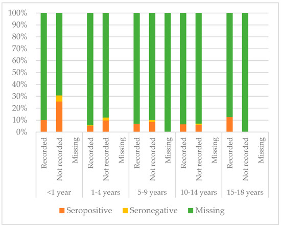 Children were subdivided according to age into five groups (<1 year, 1–4 years, 5–9 years, 10–14 years, 15–18 years) and classified as seropositive or seronegative against each specific VPD based on serotesting results. Antibody seroprevalence for each age group was calculated and expressed as a percentage.