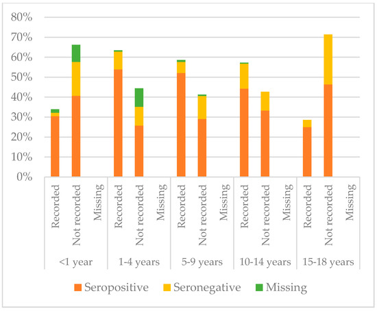 Considering the different age classes, there was no significant difference as regards to protection against diphtheria and tetanus, while children aged 0–4 years were the most frequently protected for hepatitis B; age 5–9 and age 10–18 were independent factors significantly associated with seronegativity for HBV. Interestingly, according to their documentation, most IAC aged <1 year received no dose of vaccine. Similar results were found in a recent Italian study in which the seroprevalence against hepatitis B was assessed in sera samples collected at Meyer Children’s University Hospital from the paediatric and adolescent population (1–18 years) of the Province of Florence. Indeed, children under six years of age presented the highest level of anti-HBs (80% of seropositivity in the age group) [38].