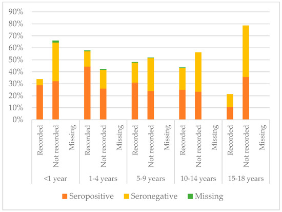 Figure 8, Figure 9 and Figure 10 compare immunisation status of IAC reported in the documentation to serology, dividing IAC by age groups. The highest proportion of children with documentation was in the group of children aged 1–4 years; 63.3% of them had a recorded vaccination against diphtheria (p = 0.002), 63.53% against tetanus (p = 0.002), and 57.9% against hepatitis B (p < 0.001). On the other hand, IAC aged 15–18 were the group with less documentation; only 28.6% for diphtheria and tetanus (p = 0.001) and 21.4% for hepatitis B (p = 0.003) provided documentation.