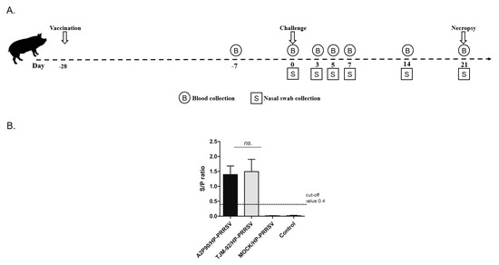 Schematic illustration of experimental protocol and ELISA examination of seroconversion prior to the porcine reproductive and respiratory syndrome virus (PRRSV) challenge. (A). After piglets were housed, A2MC2-P90 and TJM-F92 were used to vaccinate animals via the intramuscular route using 1 mL of virus stock (1.0 × 106 TCID50/mL). At 21 days post vaccination, serum samples were collected then at day 0 piglets were challenged with HP-PRRSV-XJ1. Blood and nasal swab samples were collected at indicated time points and all surviving animals were necropsied at 21 dpc. (B). After immunization of piglets with A2MC2-P90 and TJM-F92, serum samples were collected 21 days later and examined to detect seroconversion using an IDEXX HerdChek PRRS X3 ELISA kit. All experiments were repeated at least three times for each serum sample. Data are expressed as the mean ± SD and were subjected to Student’s t-test. No significant differences (NS) were observed between groups immunized with A2MC2-P90 or TJM-F92.