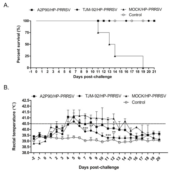 PRRSV-A2MC2-P90 protection of piglets against a lethal challenge with highly pathogenetic PRRSV (HP-PRRSV). (A). All vaccinated animals or non-vaccinated controls were each inoculated with 1.0 × 105 TCID50 of HP-PRRSV-XJ1 via both intramuscular and intranasal routes. Clinical signs and survival rates were monitored and calculated daily for a total of 21 days. (B). After inoculation of animals, rectal temperature was recorded daily for surviving animals of all groups. Data are expressed as mean ± SD and were subjected to a Student’s t-test. Significant differences between the A2MC2-P90-vaccinated group (A2P90/HP-PRRSV), TJM F92-vaccinated group (TJM-92/HP-PRRSV) and the non-vaccinated but the HP-PRRSV challenged group (MOCK/HP-PRRSV) are marked with * (p < 0.05), or ** (p < 0.01) or *** (p < 0.001).