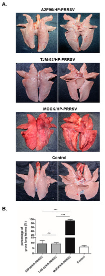 To further understand the pathological changes occurring in each experimental group after the HP-PRRSV challenge, all piglets were autopsied immediately after death or at 21 dpc if they survived until then. As shown in Figure 3A, lung lesions in unvaccinated piglets challenged with HP-PRRSV-XJA1 served as evidence of extensive pneumonia and severe pathological changes associated with the virulent HP-PRRSV-XJA1 challenge. By contrast, lungs of PRRSV-A2MC2-P90- and PRRSV-TJM-F92-vaccinated piglets resembled lungs of uninfected controls. Next, in order to better quantify observed pathological changes, a lung gross lesion score system was employed as previously described [37]. As shown in Figure 3B, lung gross lesion score differences between PRRSV-A2MC2-P90- and PRRSV-TJM-F92-vaccinated groups were not statistically significant. However, in HP-PRRSV-XJA1-inoculated piglets, extremely high scores were obtained relative to scores of other groups. Conversely, a HE stained was conducted for lung tissue samples from the MOCK group (harvested during autopsy 21 dpc) and HP-PRRSV-XJA1-inoculated group (harvested once found dead), demonstrated extensive pneumonia and severe pathological changes due the virulence and pathogenicity of challenged viruses (Figure S2). Collectively, these results demonstrated that prior vaccination with PRRSV-A2MC2-P90 or PRRSV-TJM-F92 significantly prevented pathological lung lesion development in piglets after challenge with HP-PRRSV.