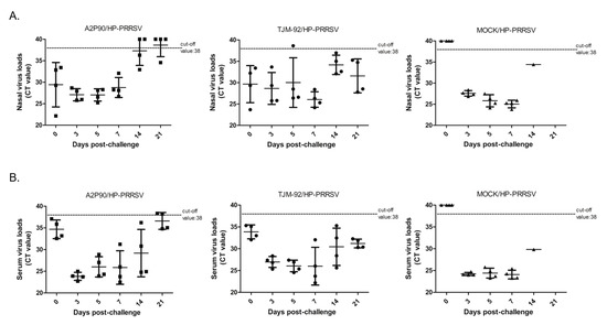 PRRSV-A2MC2-P90 vaccination reduced nasal shedding of virus and viremia after HP-PRRSV challenge of vaccinated piglets. (A). Nasal swab samples collected at indicated time points and harvested using TRIzol reagent were subjected to PRRSV RNA detection using IDEXX RealPCR PRRSV-2 RNA Mix. The Ct value of each sample is presented for comparison and was based on the manufacturer cut-off Ct value of 38. (B). Serum samples collected from each piglet at indicated time points and processed using TRIzol reagent were subjected to PRRSV RNA detection using IDEXX RealPCR PRRSV-2 RNA Mix. The Ct value of each sample is presented for comparison and was determined based on the manufacturer cut-off the Ct value of 38.