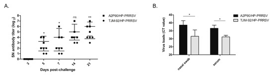 Previous reports investigating PRRSV-specific NAbs kinetics have suggested that the length of time between experimental infection and onset of NAbs detection correlates with virus clearance from circulation and tissues [14,40]. Therefore, a statistical analysis was conducted here to correlate NAbs titer with viremia or nasal virus shedding in our challenging experiments. On the one hand, as shown in Figure 5A, a statistically higher level of NAbs in the A2MC2-90-vaccinated group was observed as compared with the TJM-F92-vaccinated group. On the other hand, as shown in Figure 5B, viremia and nasal virus shedding levels (data presented as qPCR Ct values) of A2MC2-90-vaccinated piglets were statistically much lower than respective levels observed for the TJM-F92-vaccinated group, with three and two A2MC2-90-vaccinated piglets testing negative for PRRSV RNA in nasal swabs and serum samples, respectively, as based on the manufacturer’s cut-off Ct value. Taken together, these data further confirmed that higher NAbs titers contributed to more rapid clearance of viremia and reduced virus shedding in piglets.