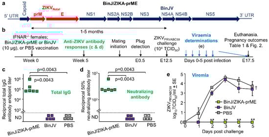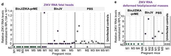 The chimeric BinJ/ZIKA-prME vaccine (Figure 1a) was generated using a modified circular polymerase extension reaction, and both BinJ/ZIKA-prME and BinJV were propagated in C6/36 cells and purified using a sucrose cushion and a tartrate gradient [10]. Purified BinJ/ZIKA-prME or BinJV were used to vaccinate female IFNAR−/− mice i.m., with control mice mock vaccinated with PBS. Antibody responses were determined 5 weeks post vaccination (Figure 1b). BinJ/ZIKA-prME vaccination induced significant ZIKV-specific IgG ELISA and ZIKV neutralizing antibody responses, with no ZIKV-specific antibodies detected after BinJV or PBS vaccination (Figure 1c,d). Timed matings were initiated at 1 month post vaccination, and after pregnancy was confirmed by weight gain, dams were challenged with ZIKVPRVABC59 at E12.5 (Figure 1b). BinJ/ZIKA-prME vaccinated dams showed no detectable viremia, with BinJV vaccinated dams showing a slightly, but not significantly, reduced viremia when compared with the PBS control group (Figure 1e). A single vaccination with BinJ/ZIKA-prME was thus able to provide complete protection against detectable viremia in IFNAR−/− mice, consistent with previous studies [10].