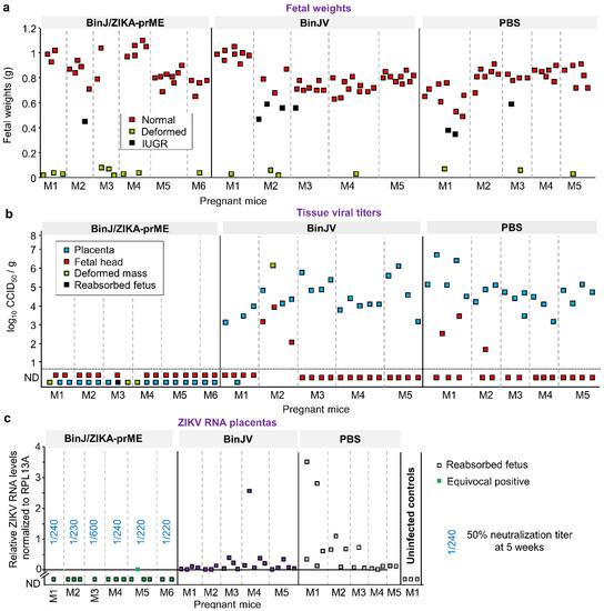 Placental and fetal samples were analyzed for the presence of infectious ZIKV. No infectious virus was detected in any placental or fetal tissues from dams previously vaccinated with BinJ/ZIKA-prME. In contrast, most of the placental and several fetal tissues contained high titers of virus in the BinJV- and PBS-vaccinated groups (Figure 2b). The deformed fetal/placental masses in the BinJ/ZIKA-prME vaccine group were also negative for virus (Figure 2b, green squares). No discernible differences between the BinJV and PBS vaccinated groups was apparent (Figure 2b). BinJ/ZIKA-prME vaccination was thus able to prevent detectable infection of both placenta and fetuses.
