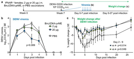 BinJ/ZIKA-prME vaccination and DENV ADE. (a) Time line of experiment (n = 6 mice per group). (b) Mean DENV-D220 viremias. Limit of detection 2 log10CCID50/mL per mouse. Statistics by Kruskal-Wallis test. (c) Mean percent weight change relative to day 0 after infection with DENV-D220. Statistics by repeat measure ANOVA for days 2 to 9 days post infection. Legend as in b.
