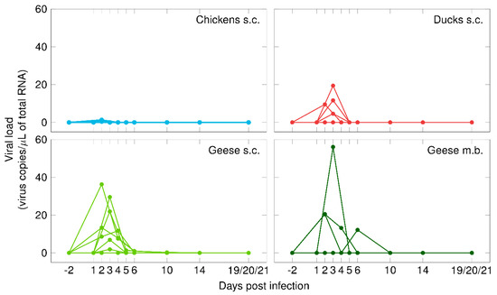 Viral shedding was observed in the chickens, ducks, and geese from 2 to 5 dpi. Similar to the low viral load in the blood, the chickens only had small quantities of WNV-specific RNA in their oropharyngeal swabs (cycle threshold (Ct) of 31.9–35.8 and 0.3–5.7 viral copies/µL of total RNA). The oropharyngeal shedding of the ducks was also fairly low (Ct 30.7–36.1 and 0.2–9.1 viral copies/µL of total RNA). Interestingly though, this was the only species with predominantly cloacal (Ct 29.6–36.1 and 0.2–19.8 viral copies/µL of total RNA) rather than oropharyngeal shedding. Geese shed the most virus and, similarly to the chickens, primarily shed oropharyngeally. The oropharyngeal and cloacal swab samples taken prior to WNV-infection and of all control animals were WNV-negative.