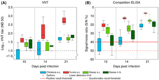 Seroconversion of chickens (in blue), ducks (in red), and geese (in green) after inoculation with WNV via subcutaneous injection (s.c.) or the bite of WNV-infected mosquitoes (m.b.; G 13 – G 16). (A) Antibody titers determined by a virus neutralization test (VNT) and (B) antibody titers determined by a commercial competition ELISA. Data are presented in a box-and-whisker plot, where the ends of the whiskers represent the minimum and maximum values. Outliers are represented by an x instead of the whisker-ends. The box includes 50% of the values of each group and the line in the middle of each group represents the median value.