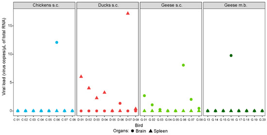 Selected organ samples of chickens (in blue), ducks (in red), and geese (in green) infected with WNV via subcutaneous injection (s.c.) or the bite of WNV-infected mosquitoes (m.b.). Brain samples depicted as filled circles and spleen samples as filled triangles. All birds were euthanized 19, 20, or 21 dpi, except for one duck (D 07) that succumbed 2 dpi.