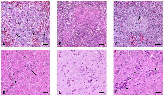 As in the other domestic species, the control geese showed no gross lesions. However, the geese infected s.c. with WNV displayed several alterations, including a pale and mottled myocard (3/8), with additional multifocal acute hemorrhages in one goose (1/3). Furthermore, mild subcapsular acute hemorrhages (3/8) and focal necrotic foci (1/8) were seen in the liver. One goose, which had been euthanized before the termination of the experiment (19 dpi) after displaying clinical signs, had multifocal erosive to ulcerative dermatitis at both elbow joints and acute multifocal to coalescing subcutaneous hemorrhages, in particular, around the injection site. Histopathological lesions were present in the brains of all infected geese (8/8), with an acute to subacute non-suppurative encephalitis (Figure 5D–F) of various degrees, ranging from oligofocal weak (3/8) and mild (3/8) to multifocal and moderate (2/8). Cerebrum (7/8) and mesencephalon (7/8) were primarily affected, whereas brain stem (6/8) and cerebellum (4/8) were involved to a lesser degree. Brain lesions consisted of oligo- to multifocal perivascular lymphohistiocytic or lymphoplasmacellular cuffing, partly with distinct leucocytic degeneration (7/8), scattered necrosis of single neurons/glial cells (8/8), glial nodules (5/8), which were in one animal (1/5) associated with distinct neuronal necrosis, endothelial hypertrophy (3/8), and the degeneration of individual Purkinje cells (3/8). Further findings included a necrotizing splenitis (2/8) (Figure 5B) and mild to moderate follicular hyperplasia of the spleen (5/8). Livers displayed variable patterns of lesions, with oligofocal subcapsular acute hemorrhages (5/8, but also observed in the control geese), interpreted as early signs of a fatty liver disease. In three infected animals, these lesions were not only associated with hepatocellular vacuolar degeneration (3/5), but also with an additional non-suppurative hepatitis (1/3) (Figure 5A) or focal necrosis (1/3). One goose even developed an oligofocal mild intralobular necrotizing hepatitis (1/8). Supplementary data Table S6 summarizes additional secondary findings and findings in the negative control birds.