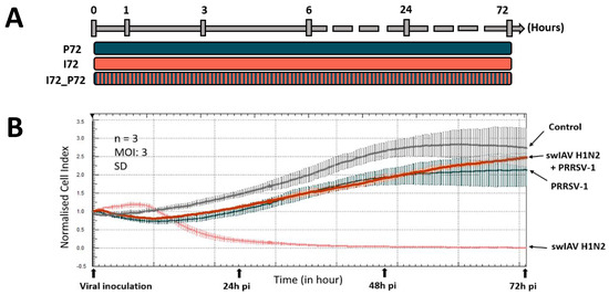 The xCELLigence real-time cell analysis (RTCA) is a recently developed tool allowing the assessment of cell growth and cytopathic effects using impedance in culture wells equipped with gold electrodes [19]. The presence of adherent cells in the wells alters measured impedance. This property can be used to monitor cell viability, migration, growth, spreading, proliferation, and any modification due to viral cytopathic effect [20,21]. Monitoring of real-time cell impedance was performed using the RTCA MP system (ACEA Biosciences, Montigny le Bretonneux, France) provided by LABÉO Frank Duncombe, Saint-Contest, France (https://www.impedancell.fr/). A dimensionless value, called cell index (CI) was measured and represented after derivation of impedance signals registered by the sensor analyzer of the monitor. Assessment of the background reading was carried out by filling all the wells of the E-plate VIEW PET (ACEA Biosciences) with DMEM. NPTr cells were seeded at 3 × 104 cells per well, incubated for 30 min at room temperature as per the manufacturer’s recommendations, and finally transferred to the RTCA-MP station placed in the incubator at 37 °C and 5% CO2. After 24 h, cells were washed twice with PBS and infected with swIAV H1N2, PRRSV-1, or both viruses. The plate was placed back and CI values were measured automatically every 10 min for 72 h. A normalization of the CI values was performed using the RTCA software version 2.0 (ACEA Biosciences) to match the last point before cell infections with the viruses [19].