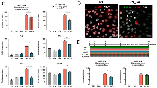 To further analyze the impact of PRRSV-1 exposition on swIAV H1N2 infection, we then carried out PRRSV-1 exposition before (1 to 6 h) or after (1 to 6 h) swIAV H1N2 infection (Figure 2A–C and Table S2). The more PRRSV-1 was added in advance, the less it interfered with swIAV H1N2 infection (Figure 2B). Indeed, the genomic loads of swIAV H1N2 were significantly more reduced (p < 0.01) when PRRSV-1 was added 1 h before swIAV H1N2 compared to the condition when PRRSV-1 was added 6 h before. Similarly, when PRRSV-1 exposition took place after swIAV H1N2 infection, the condition of 1 h delay showed a higher impact on swIAV H1N2 genomic loads compared to the condition with a delay of 6 h (Figure 2C). Regarding the genes involved in type I interferon response, their expression tended to decrease more when PRRSV-1 was added a shorter time in advance (Figure 2B,D). Conversely, their expression increased when PRRSV-1 addition was delayed (Figure 2C,D) (p < 0.05).